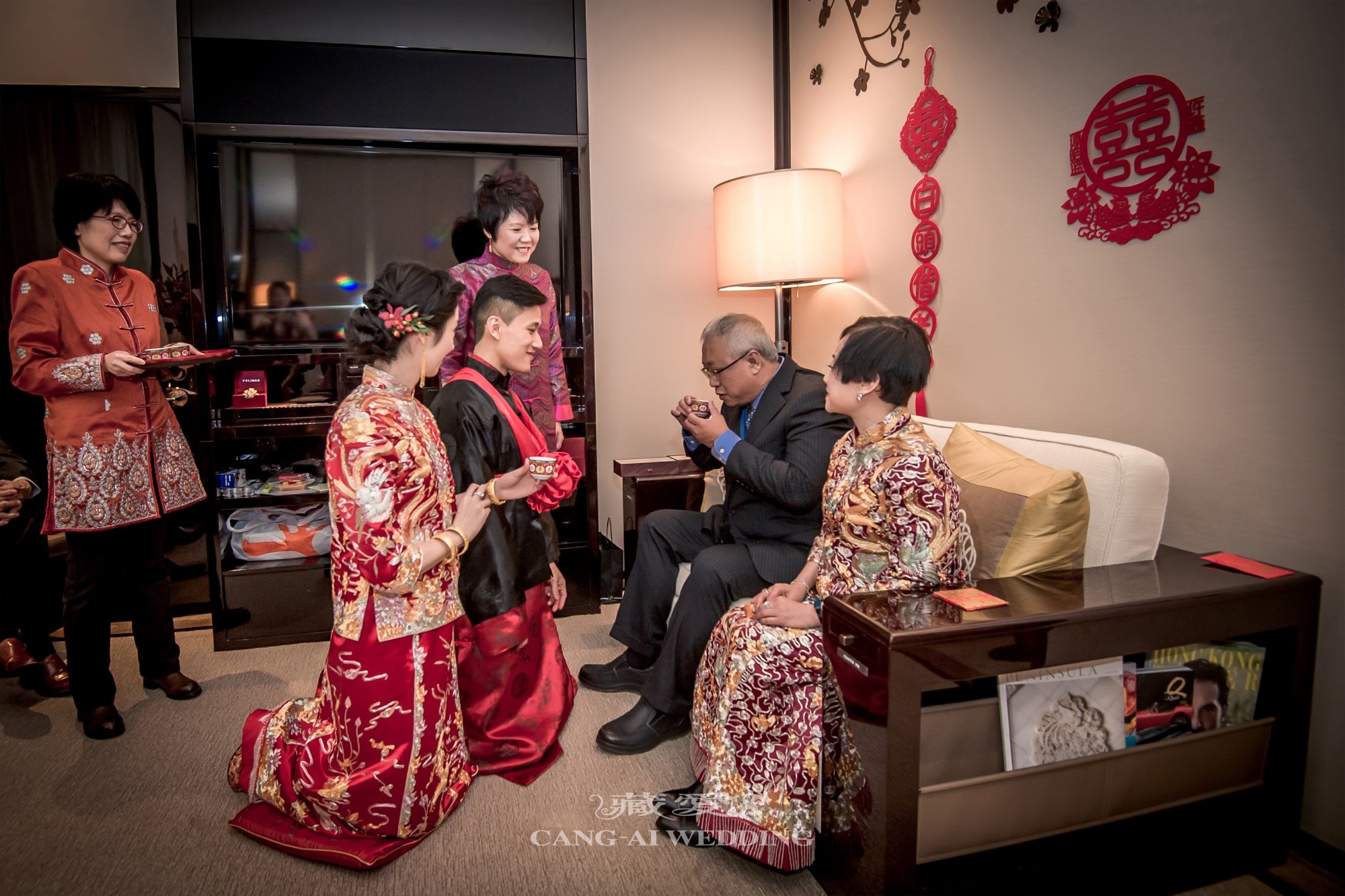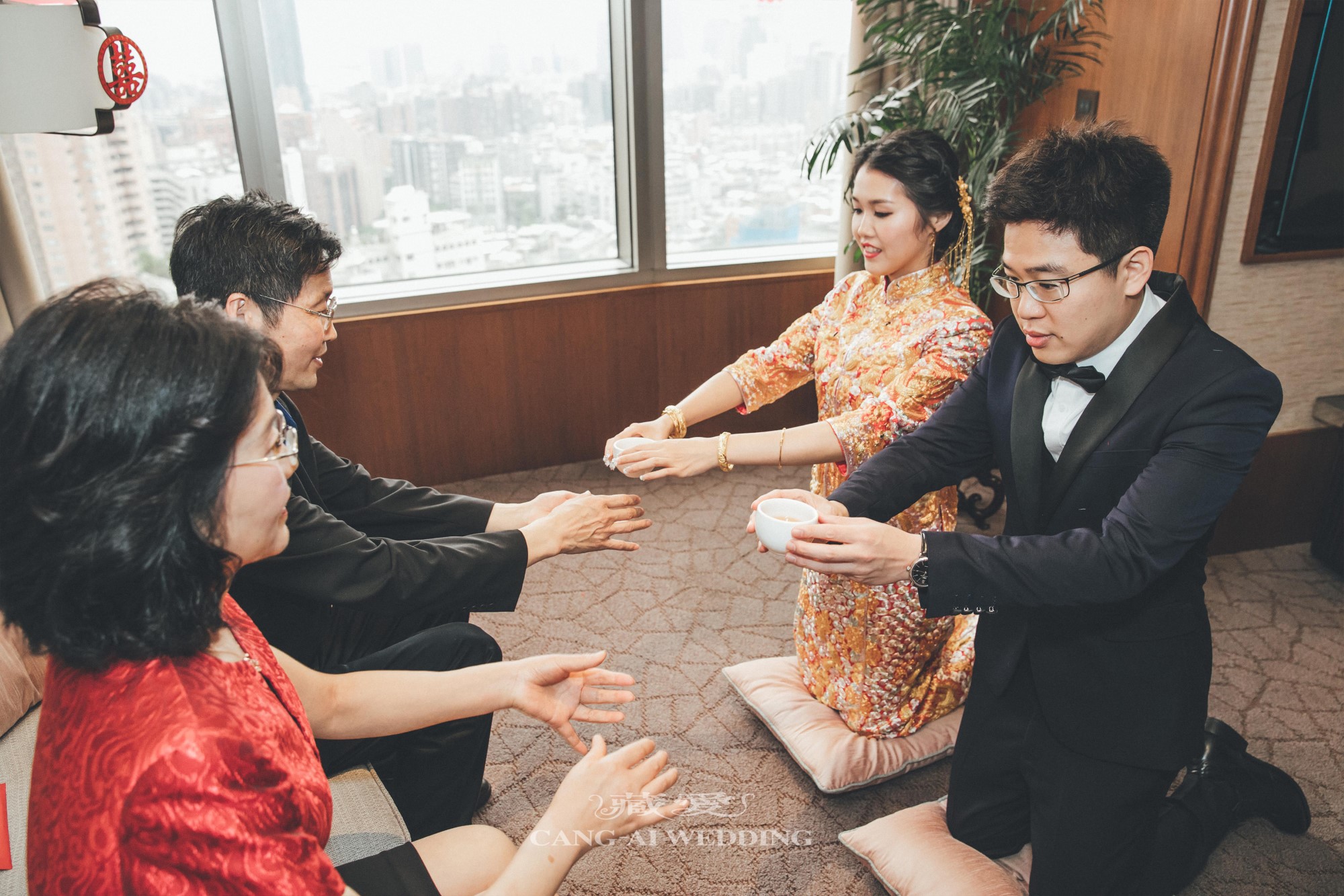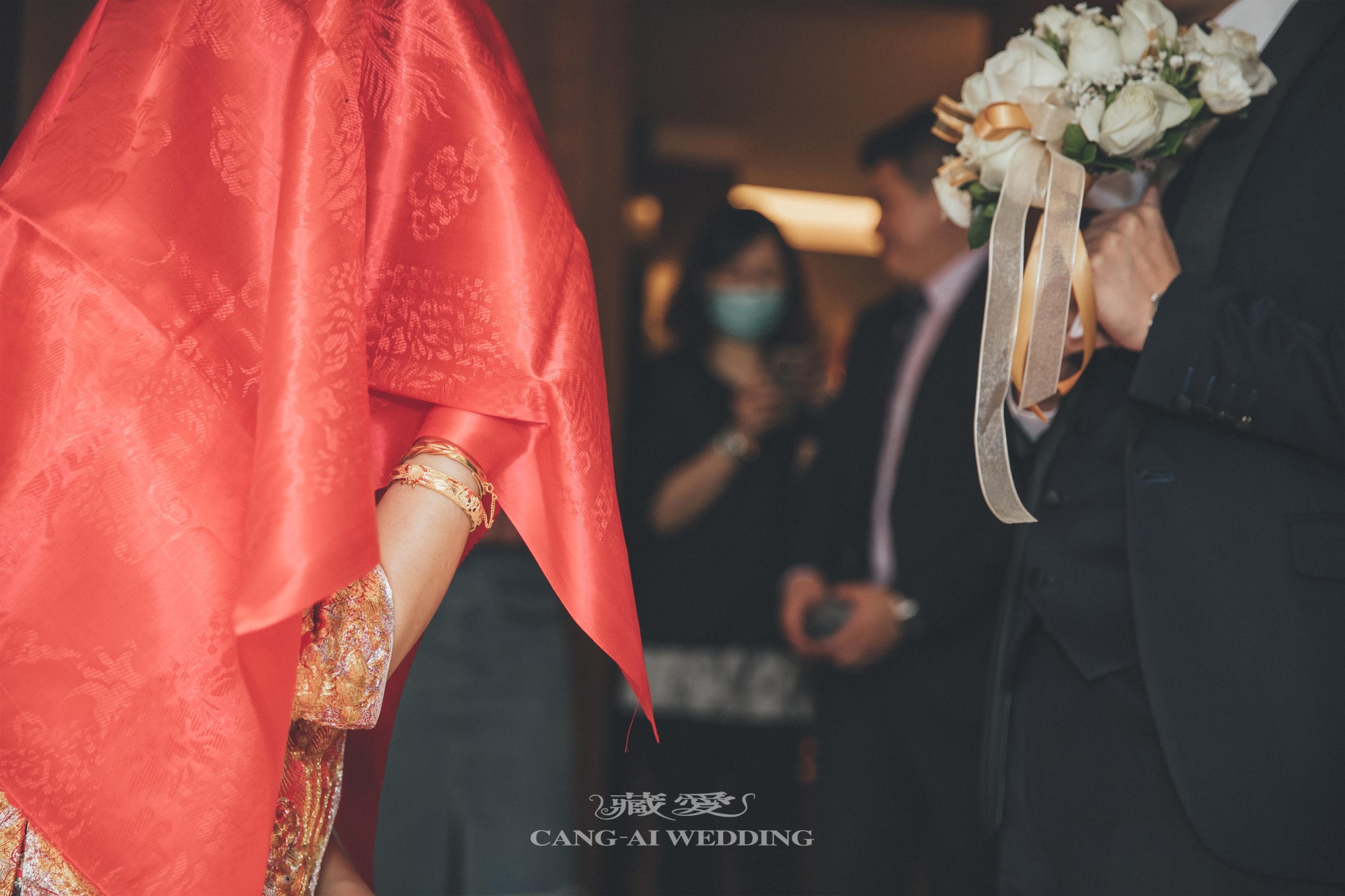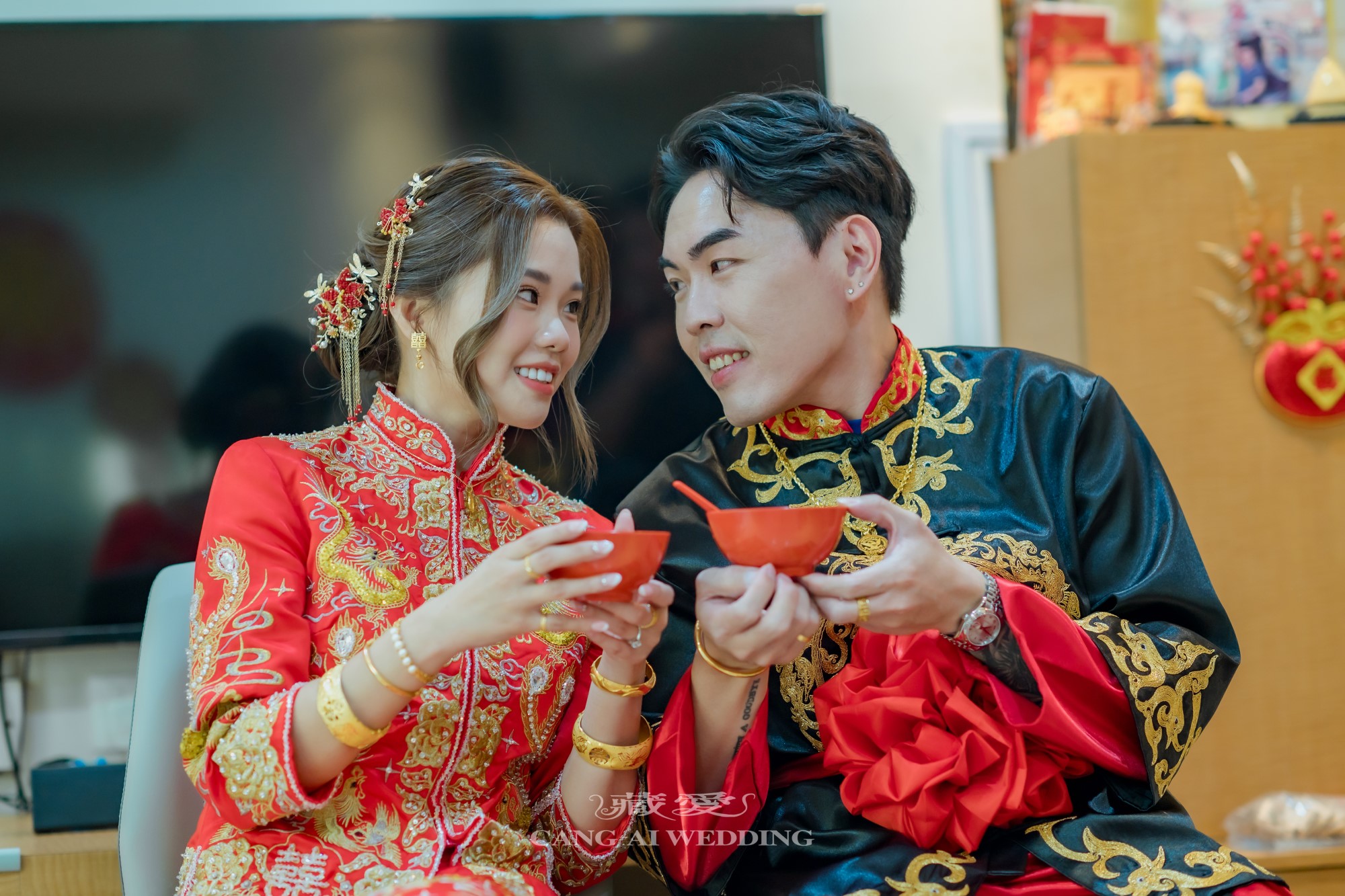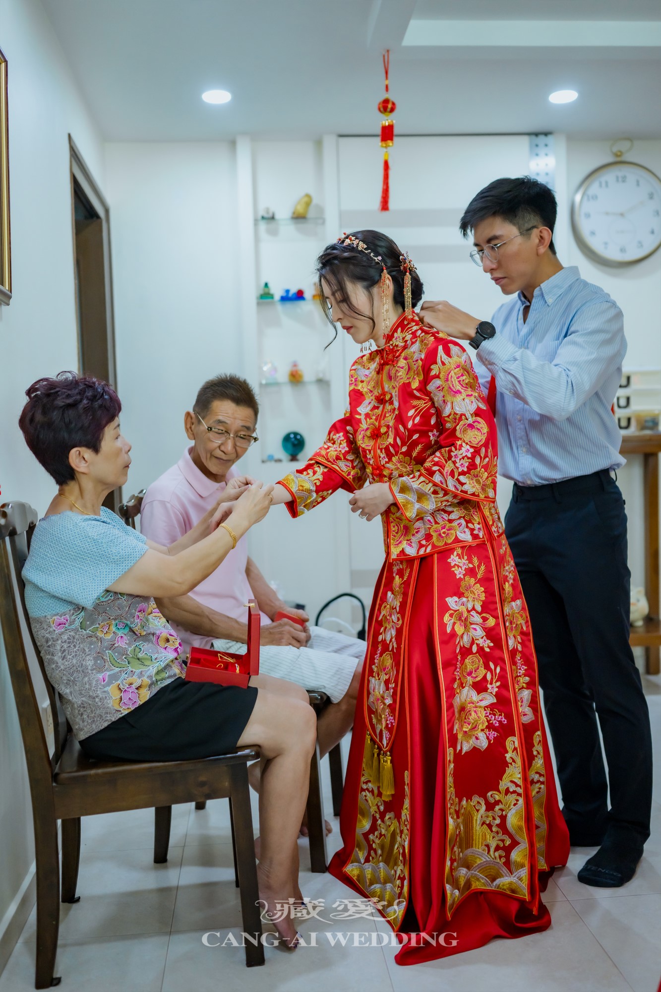 許多新人選擇在敬茶、奉茶給長輩時換上中式禮服。這一刻的服飾,不只是造型上的變化,更代表著對家族禮儀的尊重與延續。金紅交織的色彩,映照出家的溫度與長輩的欣慰笑容。