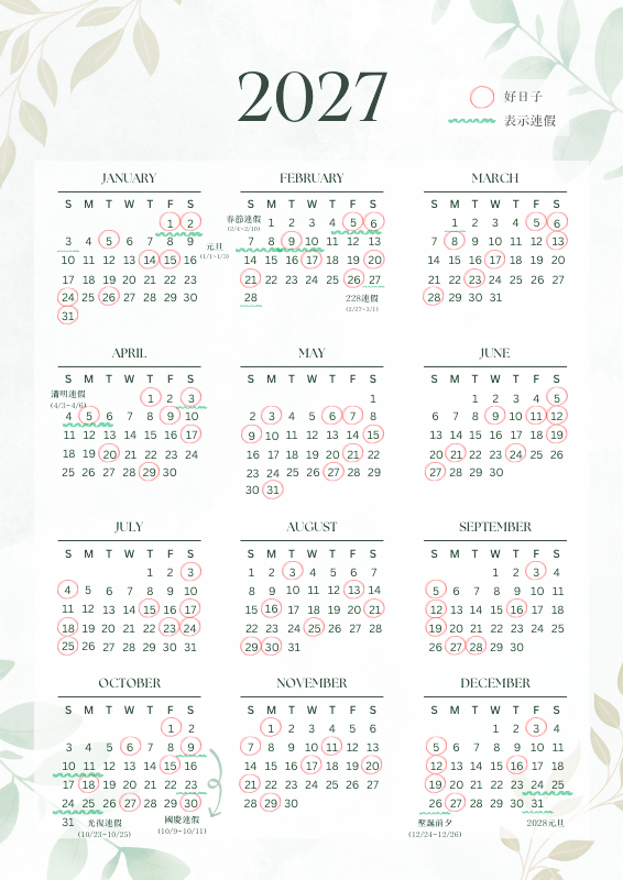 首先我們為您列出2025、2026、2027年適合請假及假期辦婚禮的好日子: