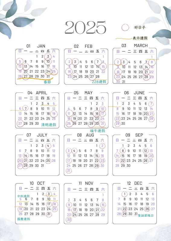 - 紅字為例假日 粉字為連假 藍字為靠近假期的好日子