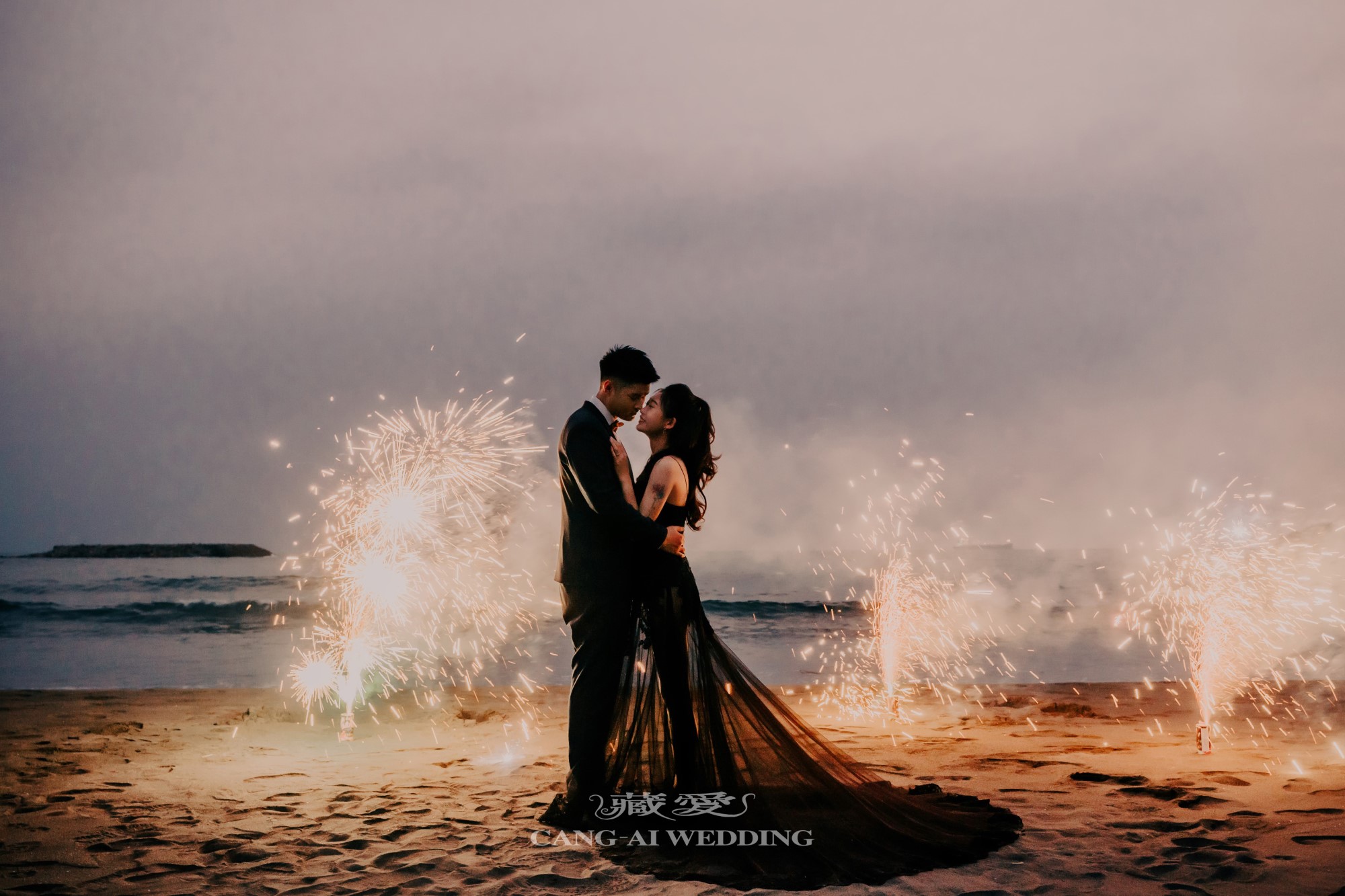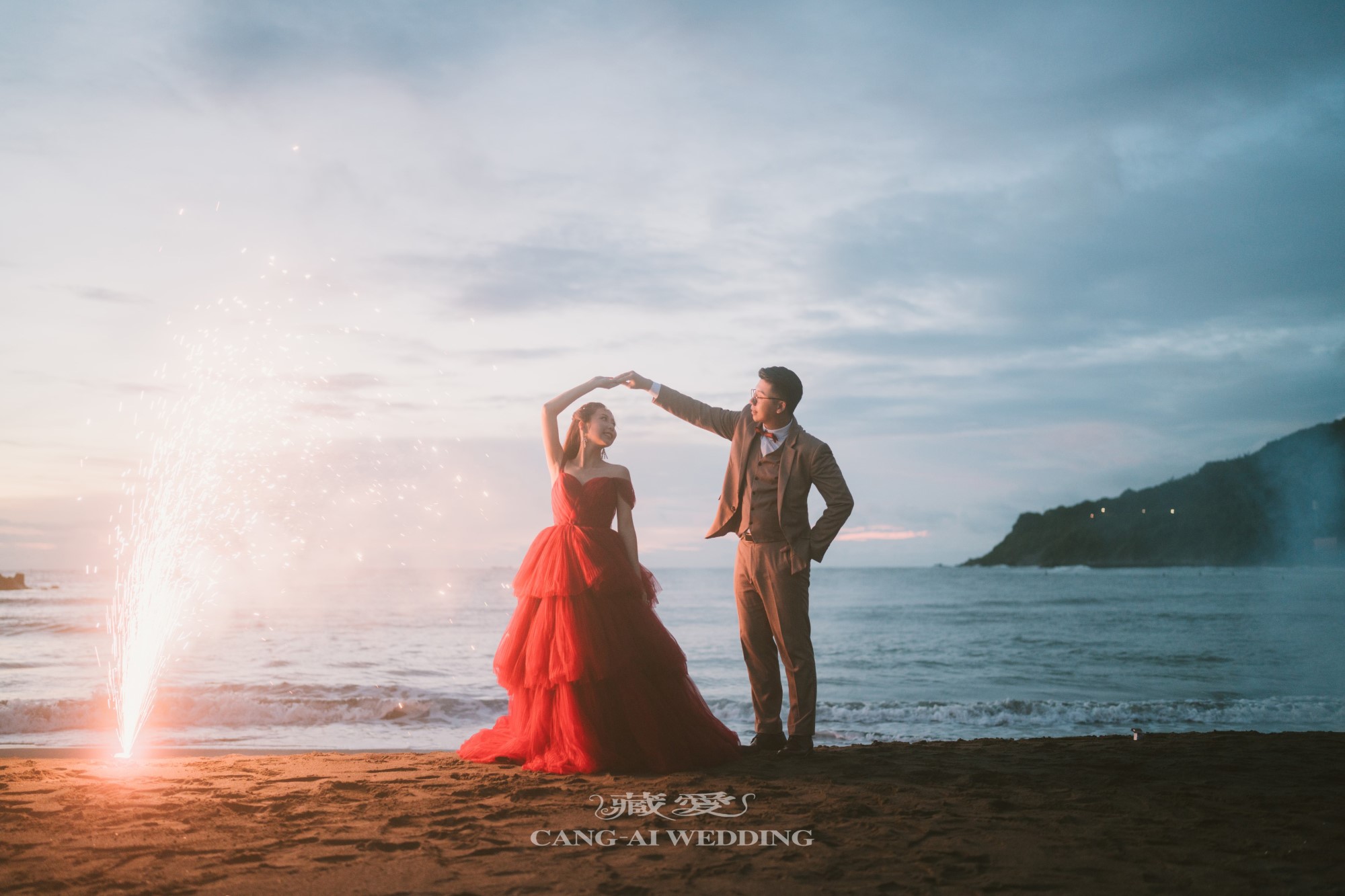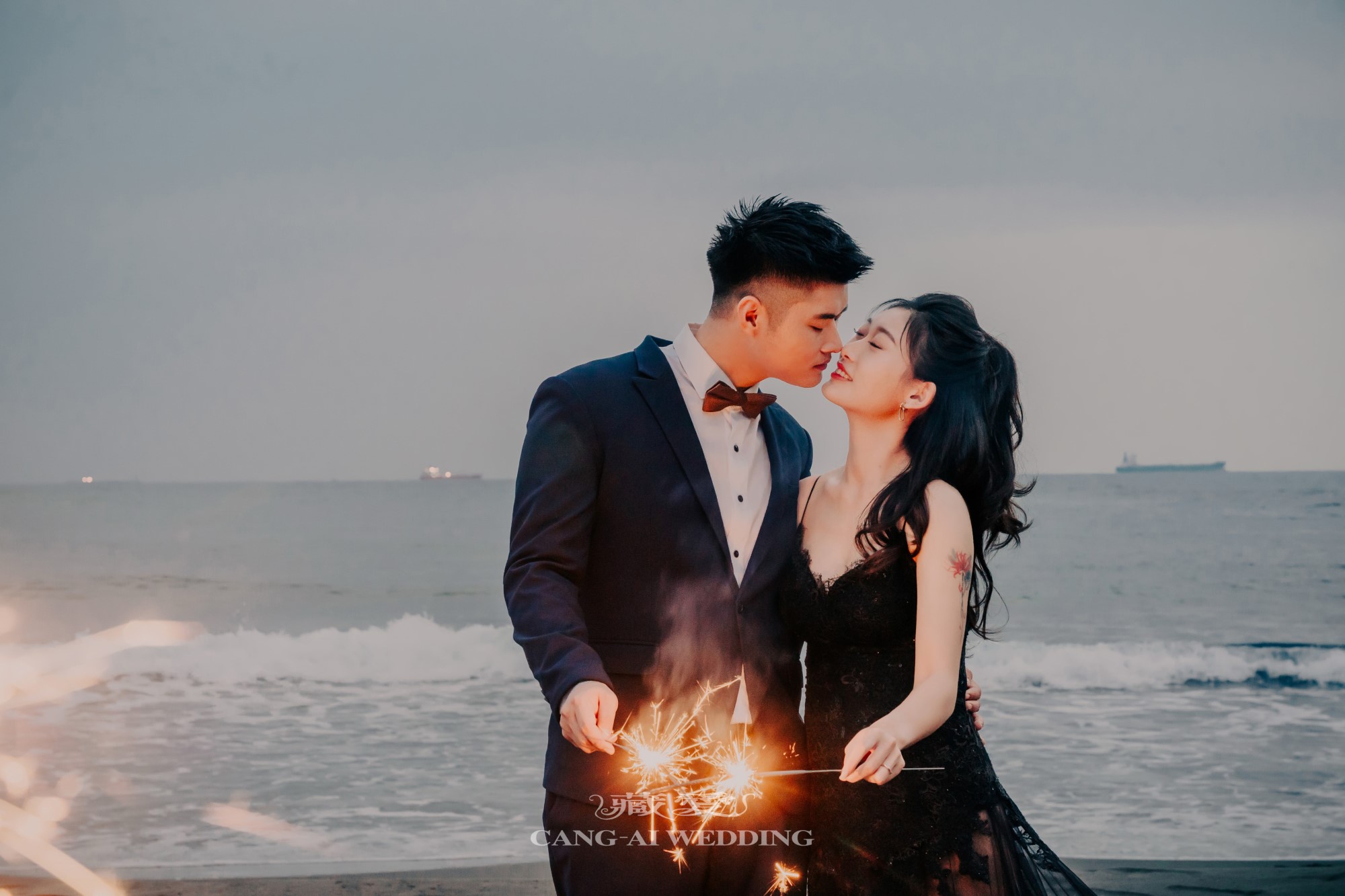 若遇上海邊煙火活動,更是千萬別錯過!煙花在傍晚的天空中綻放的瞬間,把整個海面染上浪漫色彩。當海風吹來時,兩人點起的仙女棒亮光隨著海風閃爍,每一秒都浪漫充滿故事感,也替婚紗照寫下最動人的亮點。